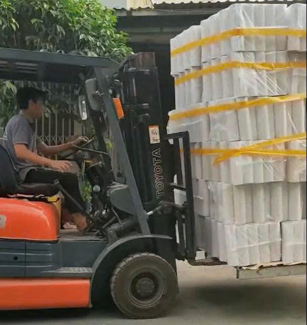 Xưởng giấy ở TPHCM cháy ngùn ngụt, nhóm công nhân dùng xe nâng di dời tài sản để ngăn cháy lan.